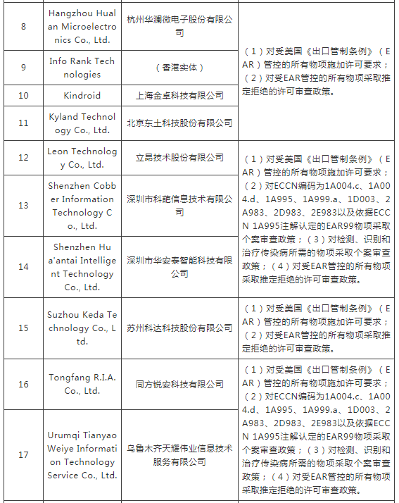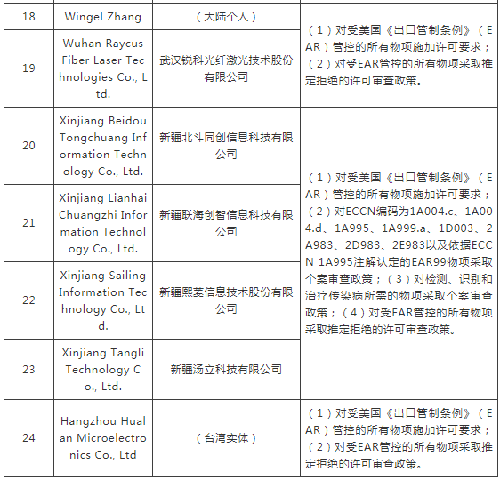 ERC認(rèn)定以下實(shí)體與所謂“中國在新疆的侵犯人權(quán)行動”有牽連,違反美國外交政策,將其列入“實(shí)體清單”。
